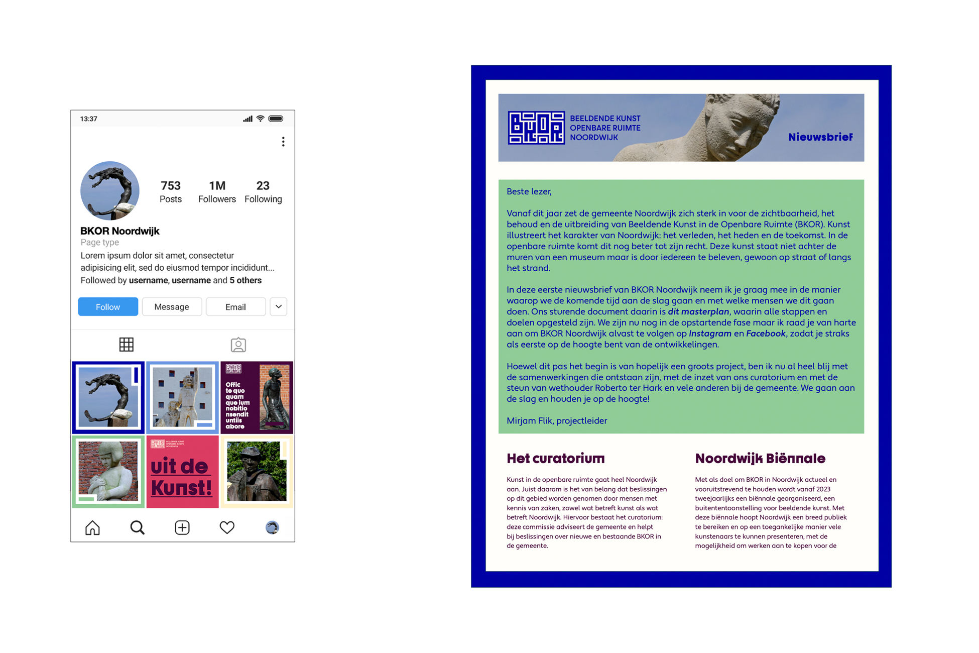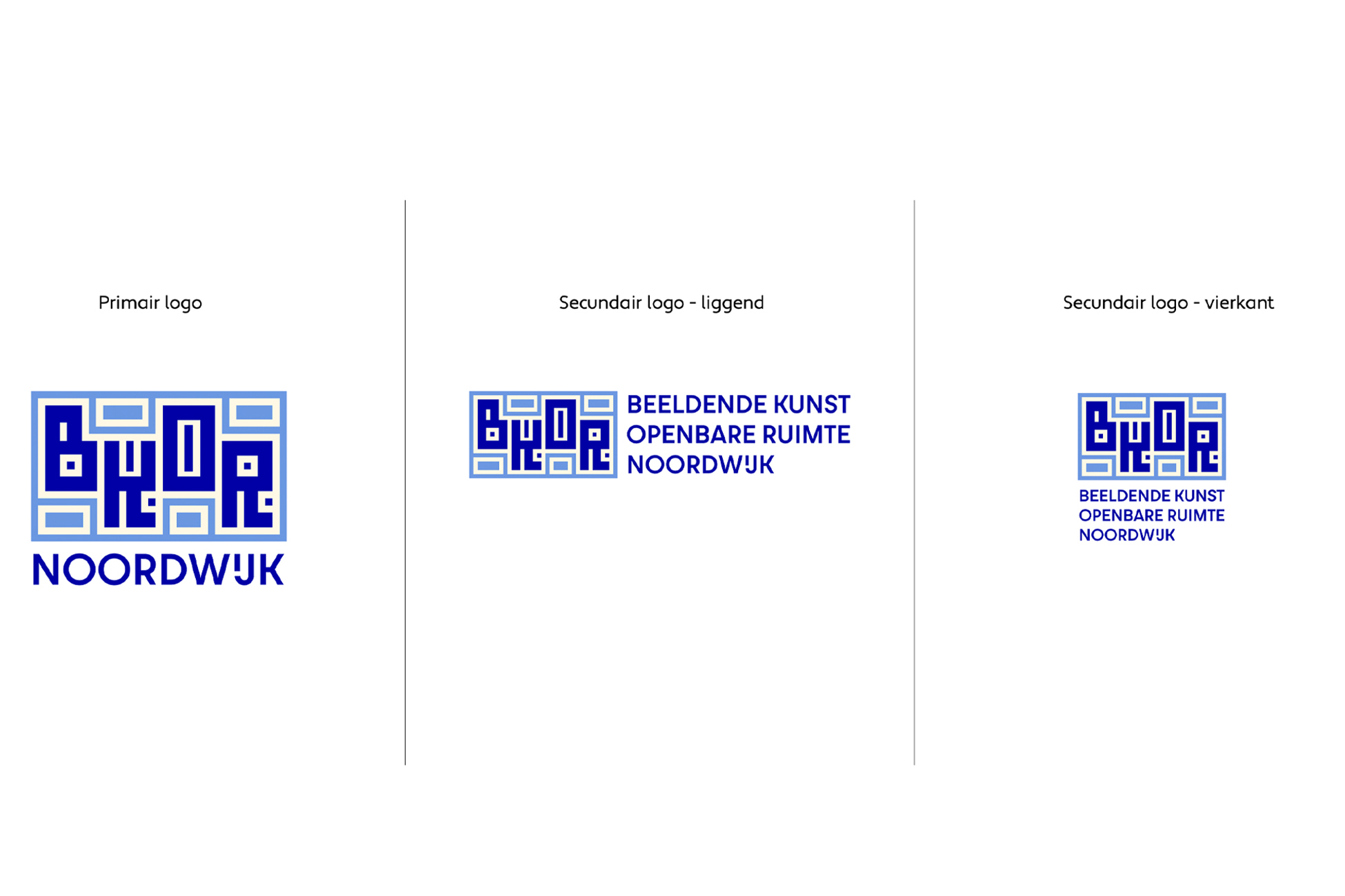 Gemeente Noordwijk zet zich in voor de zichtbaarheid, het behoud en de uitbreiding van Beeldende Kunst in de Openbare Ruimte (BKOR). Deze kunst staat niet achter de muren van een museum maar is door iedereen te beleven, gewoon op straat of langs het strand. Omdat de BKOR Noordwijk staat voor verbinding tussen uit elkaar liggende kunstwerken (zowel figuurlijk als letterlijk) is dit terug te zien in de huisstijl. Het start met een kunstzinnig logo waarin geometrische vormen een uniek letterlogo maken. Hierin is een samenspel van vormen de verbinding, het doet denken aan het landschap van bovenaf maar ook aan het muurkunstwerk in Noordwijk.